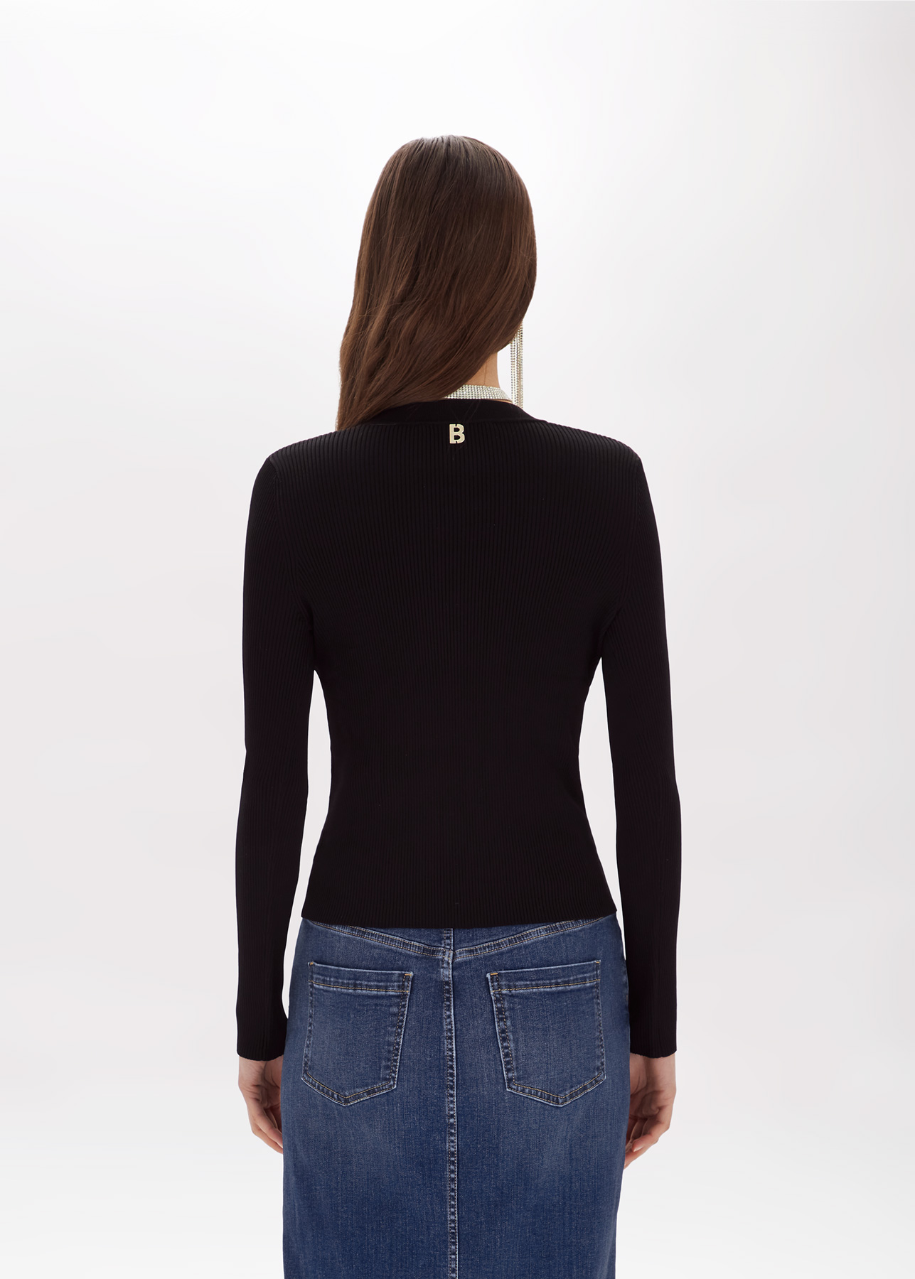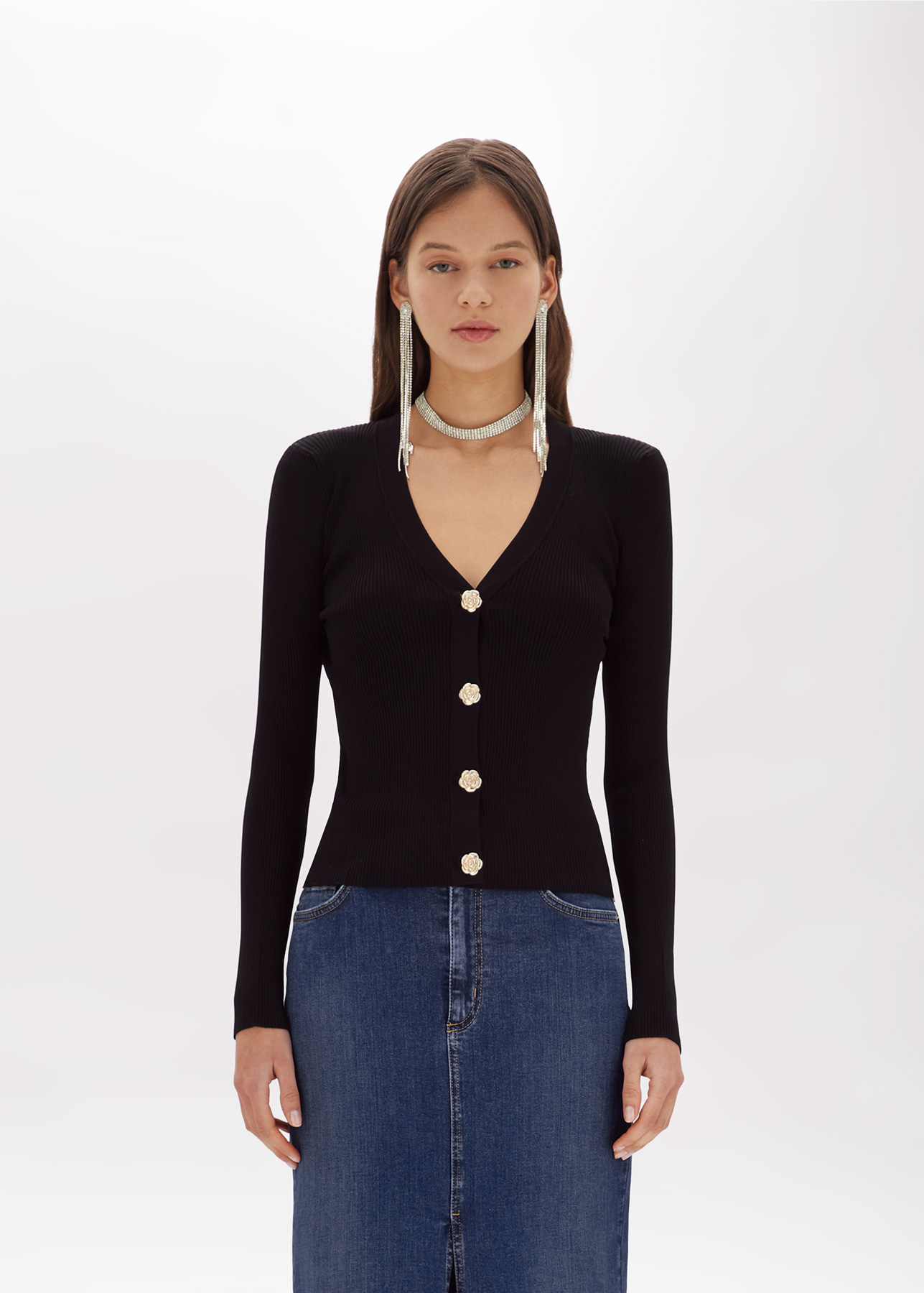 Design inedito per il cardigan BlugirlĀ a costine , linea fitted e maniche lunghe , chiusura con bottoni gioiello a fiore in metallo dorato , logo sul retro .