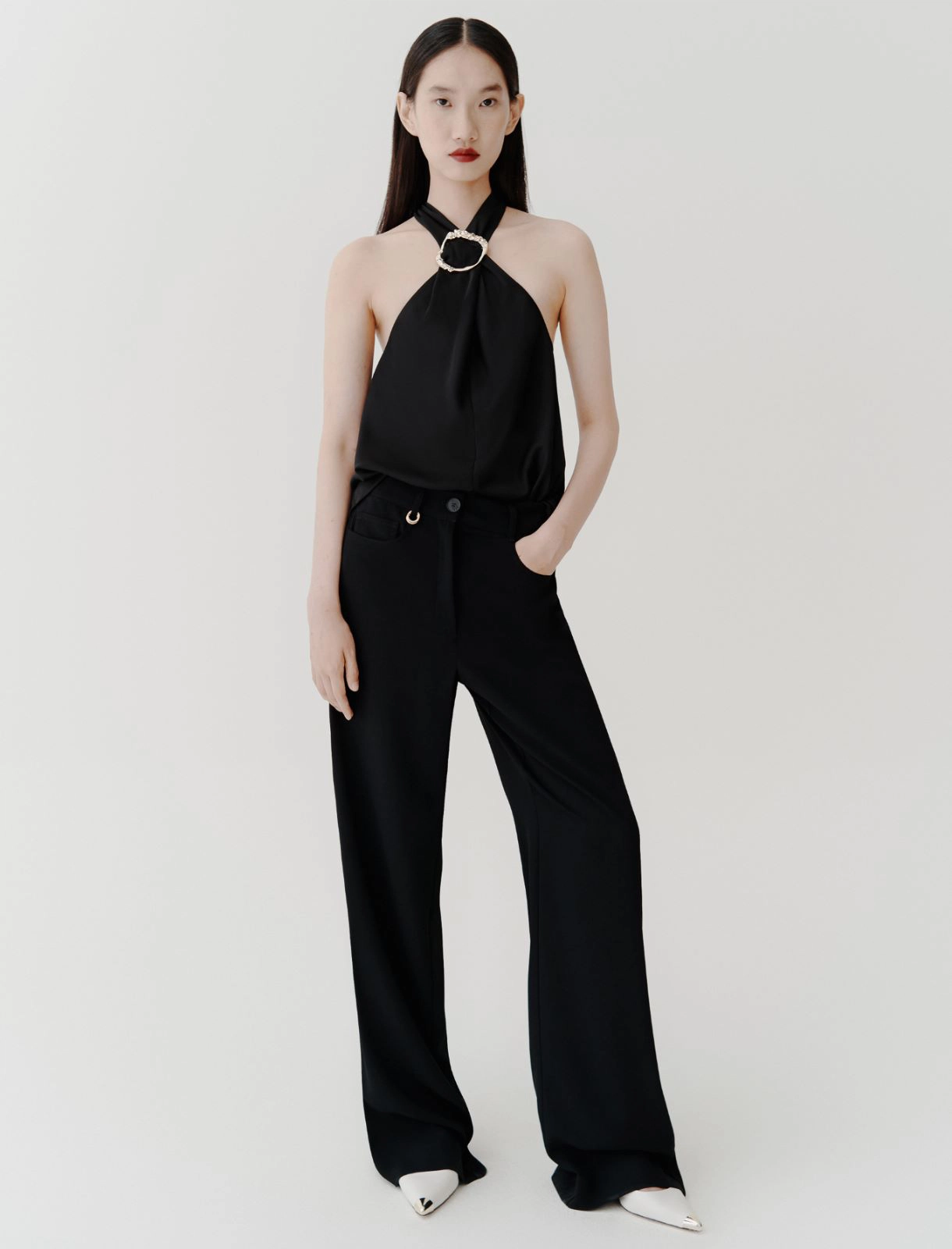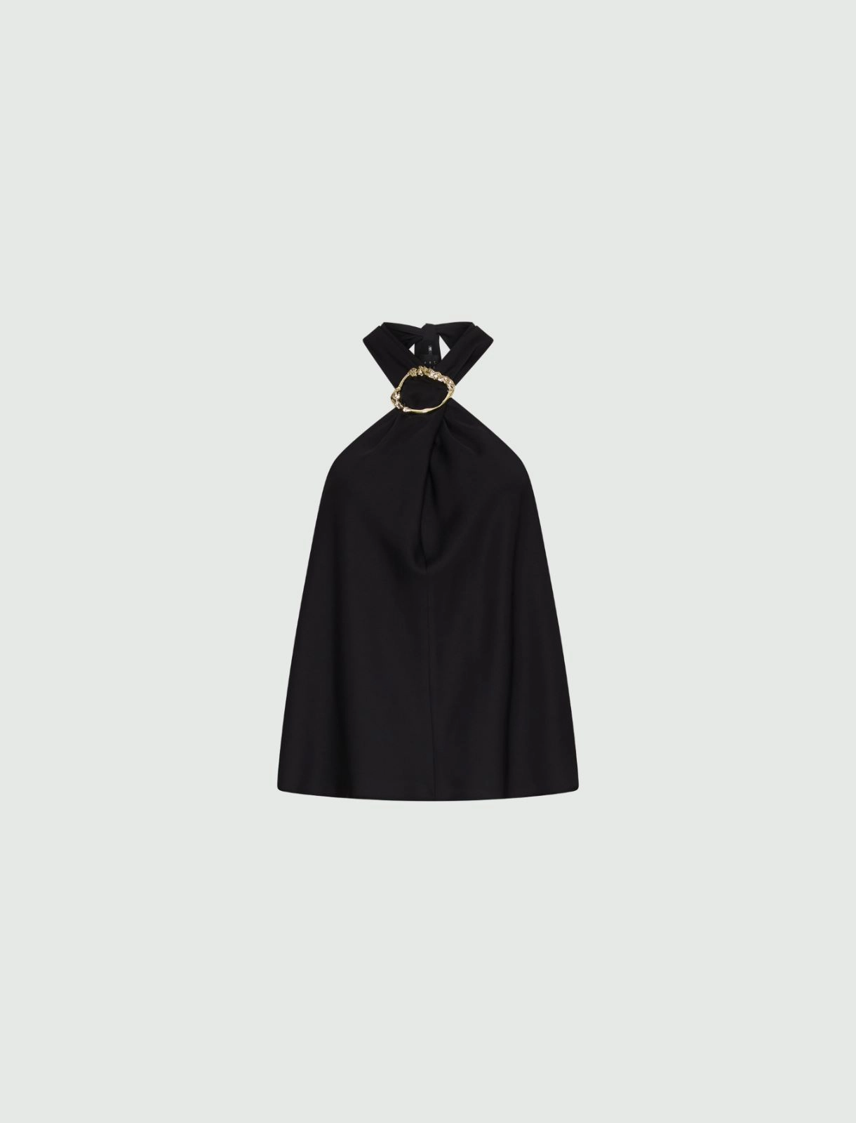 Pensato per gli aperitivi o i party più glamour, questo top lascia scoperte le spalle e aggiunge una nota artsy grazie al fermaglio scultura.